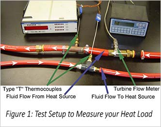 To determine Q using the above heat transfer equation, you will need to obtain the values m and ΔT experimentally. To measure these the temperature differential and mass flow rate values you will need the following equipment: Two (2x) Type “T” Thermocouples – Recommended accuracy: ± 0.2°F A Turbine Flow Meter – Recommended accuracy: ± 1% of Reading The thermocouples and flow meter can be used to measure fluid temperature change and flow rate of the cooling fluid when your system is at peak load operation (see Figure 1). Using the fluid’s specific heat (properties of commonly used fluids can be found in the Thermal Reference Guide in our Technical Library) and the above equation, heat load can be computed.